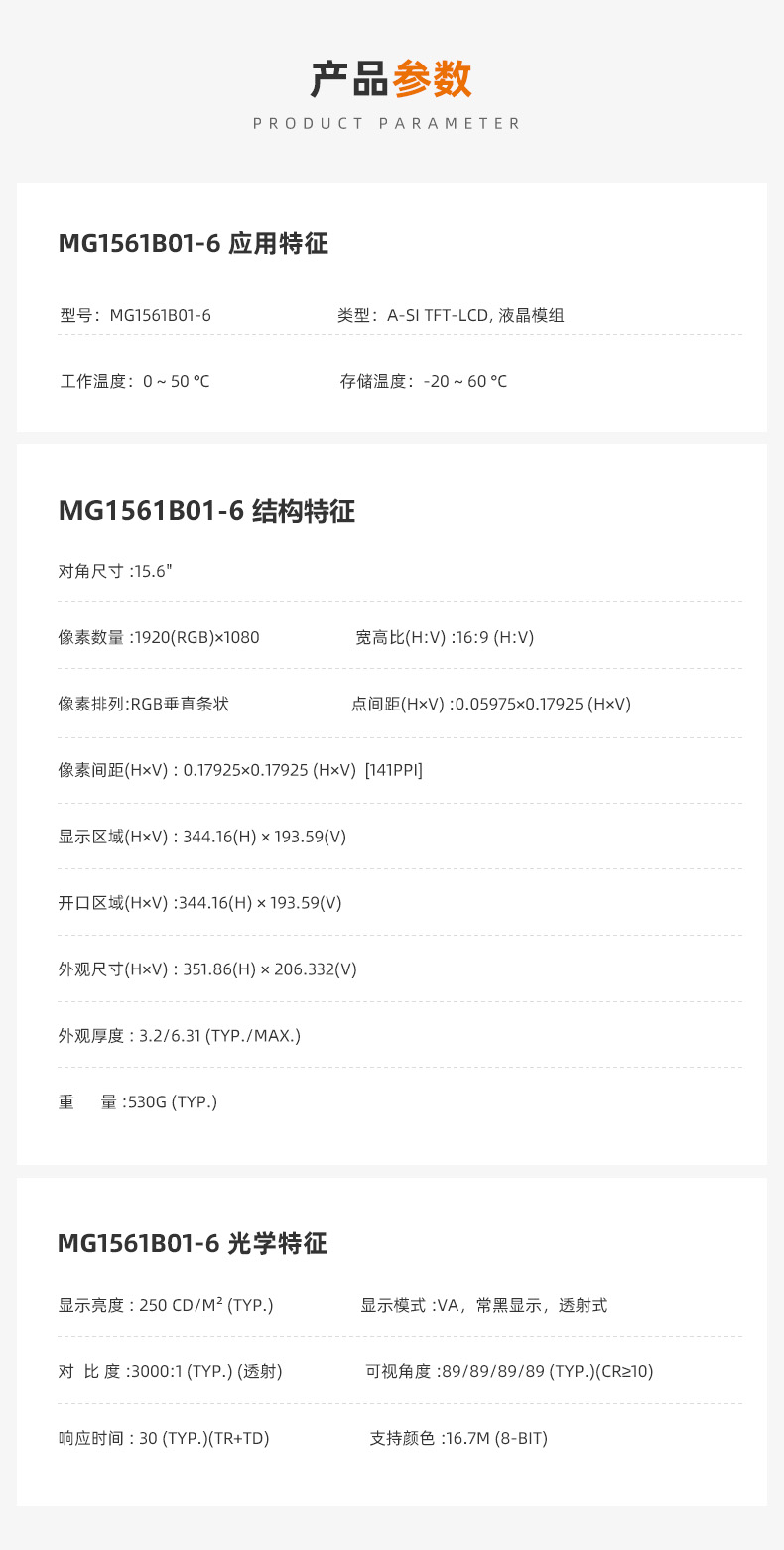 华星光电 (CSOT) 推出的MG1561B01-6是一款采用a-Si TFT-LCD技术的15.6英寸液晶模组产品,它装配有WLED背光,含LED驱动器背光驱动,无触摸。总结它的典型特征为: 白光LED背光,含LED驱动器,端子倒装,表面雾面。它的工作温度为 0 ~ 50°C,存储温度为 -20 ~ 60°C。此型号适合应用于数字标牌。
