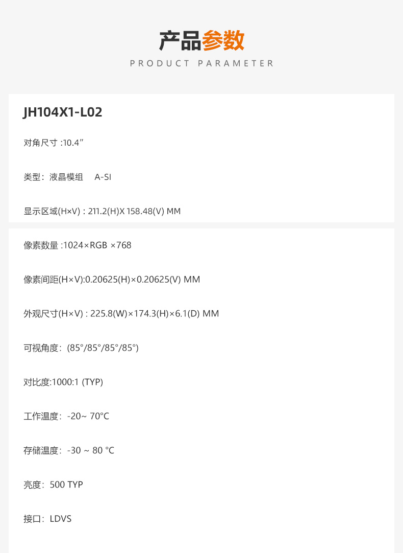瀚彩JH104X1-L02 对角尺寸:10.4英寸 像素:1024*768 显示亮度:500 可视角度:85/85/85/85